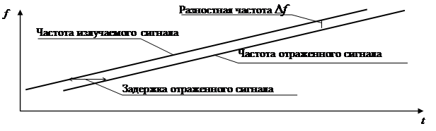Отраженный от объекта сигнал задержан относительно излученного на время распространения сигнала до объекта и обратно. Поэтому частота принимаемого сигнала будет отличаться от частоты излучаемого в момент приема сигнала на величину Df(см. рисунок), которая пропорциональна задержке отраженного сигнала. Остается измерить разностную частоту и проградуировать шкалу частотомера в единицах измерения расстояния.