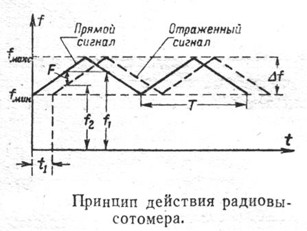 Разносная частота F не будет все время постоянной. На участках, когда частота излученного (прямого) и отраженного сигналов изменяются противоположно, разностная частота будет меньше F. Но так как период модуляции Т много больше времени задержки t1 , то этот участок кратковременный, и к заметной ошибке в измерении высоты не приводит.