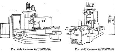 Многооперационные станки ИР500ПМФ4 (рис.13) и ИР800ПМФ4 (рис.14) предназначены для высокопроизводительной обработки корпусных деталей из различных конструкционных материалов. Наибольшая масса обрабатываемых деталей на станке ИР500ПМФ4 составляет 700 кг, на станке ИР800ПМФ4 - 1500 кг. Поворотный индексируемый стол перемещается на отдельной станине, которая крепится на общем основании. Станки оснащены устройством автоматической смены столов-спутников с двухместным накопителем, что может обеспечить автономную работу станков в течение нескольких часов. Инструментальный магазин емкостью 30 инструментов расположен на верхнем торце станков вне рабочей зоны. Смена инструмента производится автоматически по программе. Для сохранения точности станков предусмотрено устройство обдува шпинделя. Шпиндель имеет две механические ступени и прямое программирование частоты вращения через 1 мин. Станки оборудованы устройством автоматической уборки стружки, ограждением зоны резания, индексируемыми столами или столами с круговой подачей.
