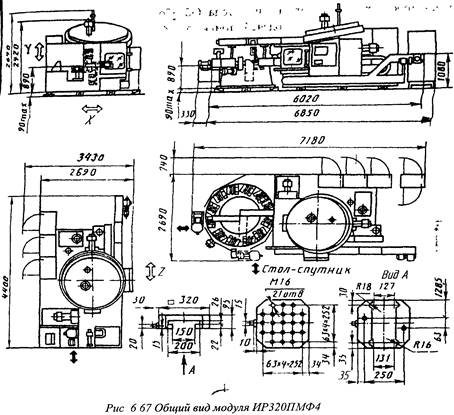 Схема компоновки ГПМ ИР320ПМФ4 (рис.16) включает одноименный станок с горизонтальным шпинделем, установленным в вертикально-подвижной шпиндельной коробке (ось Y) с продольно перемещающимся по оси Z ползуном. На верхнем торце стойки расположен 36-позиционный инструментальный магазин барабанного типа с наклонной осью вращения, обеспечивающий автоматическую смену инструмента в шпинделе без применения манипулятора. Поперечно-подвижный (ось Х) и поворотный (движение А) стол с вертикальным расположением рабочей поверхности с размерами 320x320 мм позволяет устанавливать и закреплять унифицированный стол-спутник с заготовкой, которая может быть обработана с четырех сторон за одну установку. Смена столов-спутников производится автоматически с накопителя, установленного перед станком и имеющего четыре (исполнение 1) или двенадцать (исполнение 2) позиций. Загрузка и разгрузка столов-спутников может осуществляться как вдоль продольной оси Z станка (с противоположной по отношению к шпинделю стороны), так и вдоль поперечной оси Х (перпендикулярно к оси шпинделя).