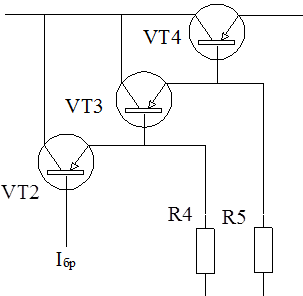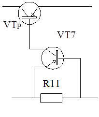 При подаче напряжения на базу транзистора VT7 он открывается и через него протекает коллекторный ток IK 7 = Ik 4 . Таким образом ток базы составного транзистора Iб VTр становится равным нулю, транзистор переходит в режим отсечки, сопротивление его «перехода» коллектор-эмиттер резко возрастает и напряжение UКЭ VTр становится равным входному напряжению, напряжение выхода становится равным нулю и ток, протекающий через нагрузку тоже становится равным нулю – происходит отключение нагрузки.