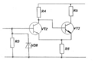 Транзистор VT4 выбираем по напряжению коллектор-эмиттер, большему чем напряжение питания, и току эмиттера, большему тока питания. Этим условиям удовлетворяет транзистор КТ814Б с параметрами Uкэ=40(В), Uбэ=5(В), Ik=1.5(A).