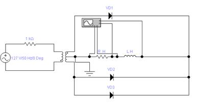 Поскольку моделирован только выпрямитель, тиристоры заменены диодами. Использован источник синусоидального переменного напряжения действующим значением 127(В) Из-за особенностей программы моделирования был использован трансформатор с коэффициентом передачи, равным единице. В результате получены осциллогрраммы, снятые с индуктивности и сопротивления: