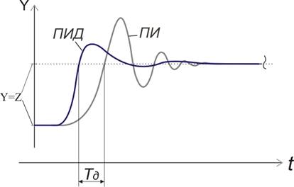 На рисунке 1 показаны графики входного регулирующего воздействия для ПИ- и ПИД-регуляторов. Время дифференцирования обозначено как Tд.