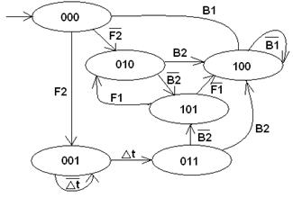 Для сокращения объема памяти минимизируем автомат. При рассмотрении задания видно, что автомат имеет шесть различных состояний. Таким образом нам необходимо три триггера, которые могут закодировать 8 различных состояний. Оставшиеся 2 состояния - называются нештатными, попадание в которые возможно при наличии какой-либо помехи. Упростим направленный граф.