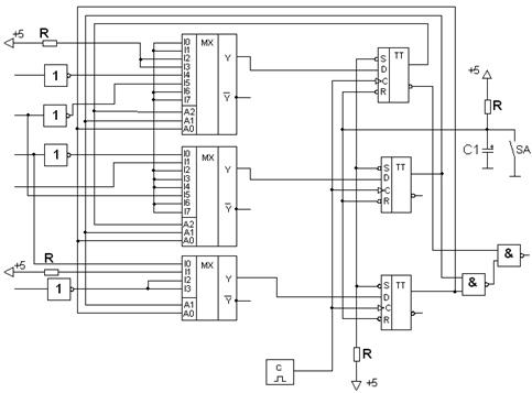 Дискретный автомат был реализован на базе мультиплексора, в качестве элементов памяти были применены динамические D- триггеры.