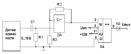 Т. к. датчик освещённости приведенный потенциальный выход 0…10В, то опорное напряжение рассчитаем от уровня 10В.