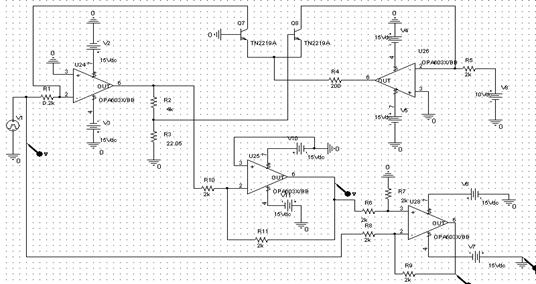 Для реализации задания потребуется логарифматор и аналоговый вычитатель. Схема реализации функции F2>X2 представлена на рис16.