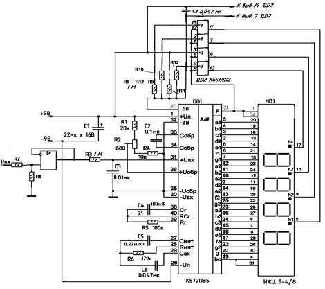 Для реализации устройства индикации индукции воспользуемся индикатором ИЖЦ 5-4/8. Индикатор имеет 4 разряда и работает в статическом режиме. Типовая схема включения преобразователя, его соединения с жидкокристаллическим индикатором и четырьмя элементами ИСКЛЮЧАЮЩЕЕ ИЛИ, необходимыми для управления десятичными запятыми индикатора, показана на рис.22. Жидкокристаллический индикатор полностью управляется АЦП типа К572ПВ5. Также воспользуемся делителем напряжения, и повторителем.