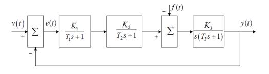 Структура исследуемой замкнутой линейной непрерывной САУ представлена на рис. 1.1, где v ( t )- управляющее воздействие, (f)- возмущающее воздействие, е( t )- сигнал ошибки, y ( t )- выходной сигнал. Значения параметров Т1 Т2 , Т3 заданы в табл. 1. Размерность Т1 Т2 , Т3 в секундах, общий коэффициент передачи К = К1 К2 К3 имеет размерность 1/с, в табл. 1 заданы также желаемые показатели качества системы: максимальная ошибка по скорости еск при скачке по скорости v ( t ) = v 1 t и f = 0, время переходного процесса t п.п в секундах, и перерегулирование у в процентах.