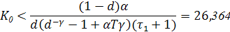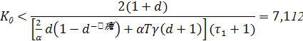 В неравенстве при известных значениях γ, Т , τ1 , Т1 входит величина К0 . Таким образом, можно выделить отрезок значений К0 "<К0 <К0 , при которых система будет устойчива и далее принять К0 = 0.5К'0 . Условия устойчивости будут: