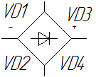 Випрямляч мостовий двонапівперіодний (Рис. 4.2) складається з чотирьох напівпровідникових випрямляючих діодів, призначений для випрямлення напруги. Постійний струм потрібен для формування синхроімпульсів і для нормальної роботи мікросхеми. Вузол працює звичайно – після надходження на катод VD1 напруга не проходить до анода і тому буде зворотньою і набуває знаку «-»; пройшовши через VD3, напруга набуває знаку «+», оскільки діод знаходиться у прямому включенні; у такому випадку напруга не буде протікати через VD2 iVD4, набуде негативного знаку і тоді випрямлена напруга протікатиме через навантаження до цих діодів; напруга буде прямою відносно них.