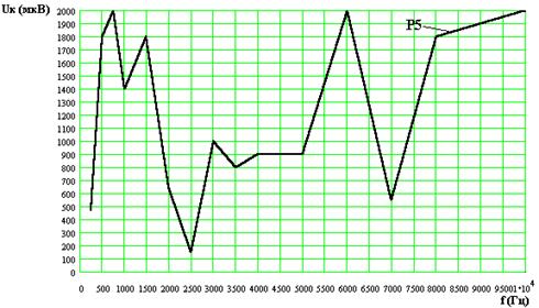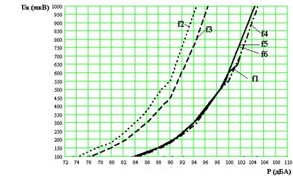 Рис. П.4.4. График зависимости отношения "сигал/шум" от частоты при интегральных уровнях Р1=70 дБА, Р2=75 дБА, Р3=80 дБА, Р4=85 дБА, Р5=90 ДБА.