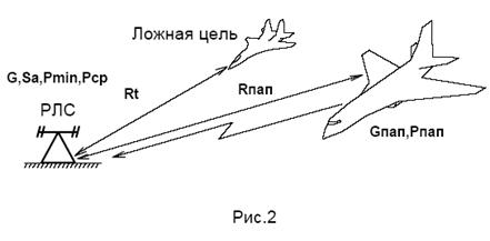 На рис.3 показана зависимость требуемой мощности передатчика помех от расстояния до РЛС, при имитации цели находящейся на максимальной дальности(Rmax =300 км). Здесь хорошо видно, что если РПАП попадает в заштрихованную область, то сигнал на входе РЛС попадает в интервал 2·Pmin ..4·Pmin , а значит, помеха обладает энергетическими свойствами сигнала реальной цели находящейся на соответствующей дальности.