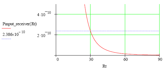 Как видно из этих графиков минимальная мощность на входе РЛС, требуемая для обнаружения цели обратно пропорциональна корню четвёртой степени расстояния до цели. Соответственно, мощность передатчика уводящей помехи необходимо менять в зависимости от требуемой имитируемой дальности ложной цели.