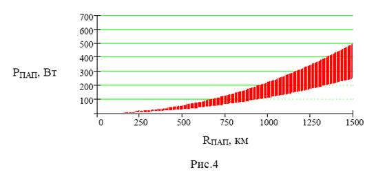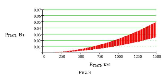 Данные зависимости в целом характеризуют зоны прикрытия уводящими помехами. Допустим, если RПАП =750 км, то для прикрытия зоны видимости РЛС от 30 до 300 км, мощность передатчика помех надо менять в диапазоне приблизительно от 100 Вт до 10 мВт.