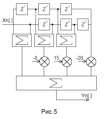 Здесь применена схема, подвергшаяся упрощению вынесением за скобки одинаковых сомножителей, благодаря симметричности коэффициентов фильтра. Всё это позволяет сократить число умножителей, что упрощает аппаратную реализацию устройства.