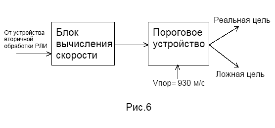 Данный алгоритм реализуется программно в устройстве ВОИ и позволяет достаточно эффективно подавлять уводящую помеху. Принцип действия основан на сравнении пороговым устройством, скорости вычисленной по результатам траекторной обработки с пороговым значением Vпор , характерным для реально существующих самолётов (около 3 Мах). Скорость вычисляется по формуле: