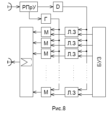 Упрощённая структурная схема устройства постановки уводящих помех изображена на рис.8. В разведывательном радиоприёмном устройстве (РПрУ) производиться измерение параметров подавляемой РЛС. Генератор (Г), генерирует колебания несущей частотой равной несущей РЛС.