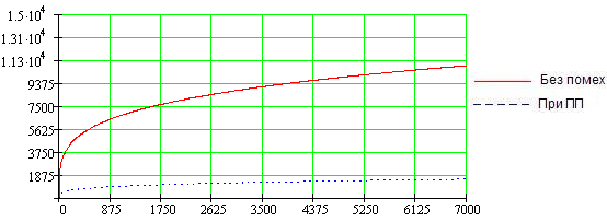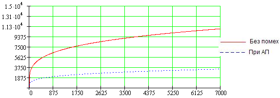 Допустим что ПАП находиться на расстоянии 500 км, с заданной мощностью=20кВт(что было рассчитано ранее). Из графика хорошо видно, что при действии активной помехи по боковым лепесткам ДН антенны РЛС, она будет уменьшать дальность действия РЛС.