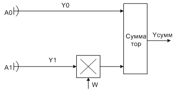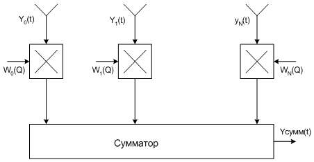 Таким образом, в направлении на источник помехи образуется провал в ДНА. При действии нескольких помех с ряда направлений необходимо применение большого количества компенсирующих антенн, чтобы антенна А0 и одна из других антенн Аi образовали компенсирующее устройство активной помехи с i-ого направления. Структурная схема устройства пространственной обработки для подавления нескольких пространственных помех приведена на рисунке 5.