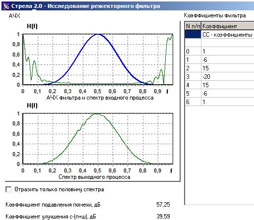 Мерой эффективности режекторного фильтра служит достигнутый, коэффициент подавления. В нашем случае он равен 57.25 дБ, т.е. сигнал помехи фильтр подавляет до уровня шумов. Таким образом, помеха практически полностью исключается из дальнейшей обработки.