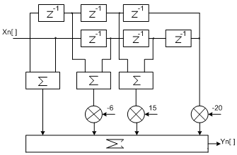 Чтобы упростить аппаратную реализацию устройства сократим количество умножителей основываясь на симметричности коэффициентов фильтра.
