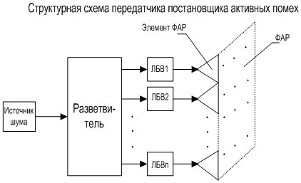Данная схема использует сложение мощностей и работу на одну антенну. ФАР позволяет сконцентрировать всю энергию в узком луче и направить его на подавляемое РЭС. Это наиболее перспективная схема, к достоинствам которой можно отнести простоту изготовления и применения а также дешевизну конструкции если стоит вопрос о большом количестве изготавливаемых передатчиков.