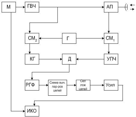 На основе приведенных выше рассуждений и расчетов нам известно что необходимо применять когерентную систему. Ниже приведем один из возможных вариантов построения псевдокогерентного радиолокатора высокой скважности (рис. 11). Такое построение когерентно- импульсных радиолокаторов[5, стр. 169] характерно при использовании однокаскадных передатчиков. Генератор ВЧ работает в режиме самовозбуждения при модуляции импульсами высокой скважности. Опорный когерентный сигнал формируется когерентным гетеродином, который синхронизируется по фазе импульсами генератора высокой частоты, предварительно преобразованными на пч, так как когерентный генератор работает на промежуточной частоте. Принятые сигналы сравниваются с опорным на пч в детекторе. РГФ осуществляет селекцию сигналов движущихся целей. После этого производится вычисление параметров целей, затем селекция ложных целей. После усиления в усилителе сигналы движущихся целей подаются на индикатор.