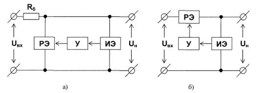 Рисунок 2.2 – Структурные схемы компенсационных стабилизаторов: а) параллельного типа, б) последовательного типа