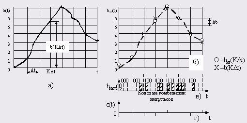Преобразование аналог-цифра состоит из трех операций (рис.2.2): сначала непрерывное сообщение подвергается дискретизации по времени через интервалы Δt (рис.2.2, а); полученные отсчеты мгновенных значений b(kΔt) квантуются (рис.2.2,б); наконец, полученная последовательность квантованных значений bкв (kΔt) передаваемого сообщения представляется посредством кодирования в виде последовательности т-ичных кодовых комбинаций (рис.2.2,в). Такое преобразование называется импульсно-кодовой модуляцией.