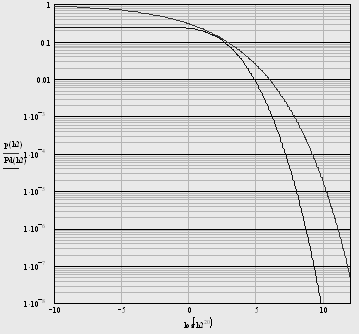 < 1. Подставив значения информационной эффективности для систем без и с помехоустойчивым кодированием, построим (рис.6.1) два графика предельной зависимости по формуле, которую получаем из (6.4):
