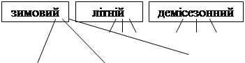 Розглянемо, для прикладу, фасетну класифікацію одягу при використанні трьох ознак (фасетів): вид тканини, сезонність, призначення (рис.3).