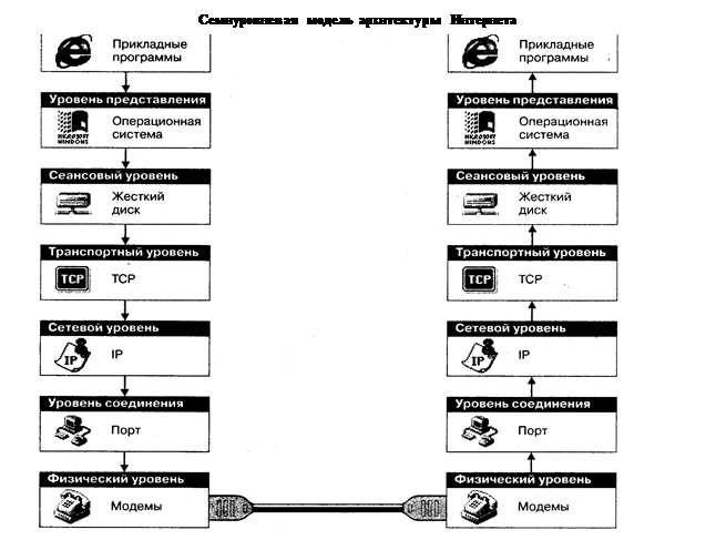 6. Уровень соединения. Дело подходит к тому, чтобы физически передать сигналы с одного компьютера на другой, например с помощью модема. На этом уровне цифровые данные из пакетов, созданных ранее, накладываются на физические сигналы, генерируемые модемом, и изменяют их (принято говорить модулируют). Как и все операции в компьютере, эта операция происходит под управлением программ. В данном случае работают программы, установленные вместе с драйвером модема. При взгляде с шестого уровня Интернет — это совокупность компьютерных сетей или автономных компьютеров, объединенных всевозможными (любыми) средствами связи.