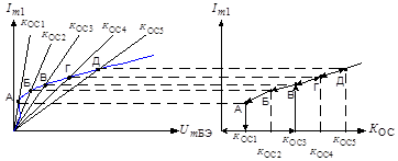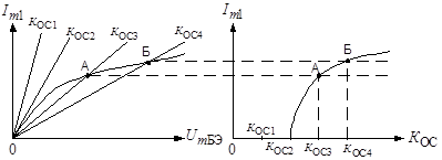 Проведем анализ режима (аналогично мягкому режиму самовозбуждения) по колебательной характеристике автогенератора Im 1 = f (Um БЭ ) и характеристике Im 1 = f (К ОС ), представленных на рисунках 2 а) и б) соответственно.