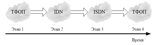 Второй этап – цифровизация телефонной сети.Для повышения качества услуг связи, увеличения их числа, повышения автоматизации управления и технологичности оборудования, промышленно развитые страны в начале 70‑х годов начали работы по цифровизации первичных и вторичных сетей связи. Были созданы интегральные цифровые сети IDN (IntegratedDigitalNetwork),предоставляющие также в основном услуги телефонной связи на базе цифровых систем коммутации и передачи.