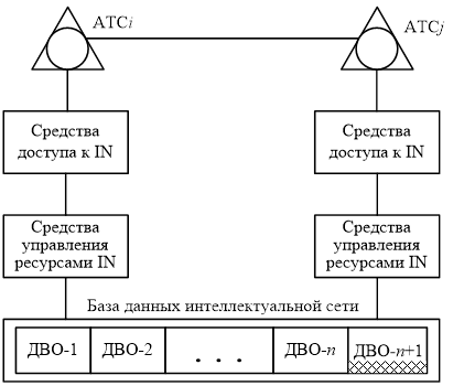 Прежняя стратегия ввода новых ДВО основывалась на замене старой (с меньшим набором ДВО) версии программного обеспечения (ПО) на всех узлах сети на новую (с новым набором ДВО). В IN добавление новых ДВО обеспечивается изменением программных средств в сетевой базе данных (БД) без изменения ПО на станциях и узлах сети. Однако такая индифферентность ПО станций к видам и составу ДВО подразумевает наличие на станциях сети средств доступа к ресурсам IN, а на одном из уровней распределения ресурсов IN– средств управления предоставлением ДВО [4, 5]. На рис. 1.2 показан пример расширения спектра ДВО в интеллектуальной сети. Для ввода новой услуги (выделено штриховкой) требуются изменения только в БД интеллектуальной сети.