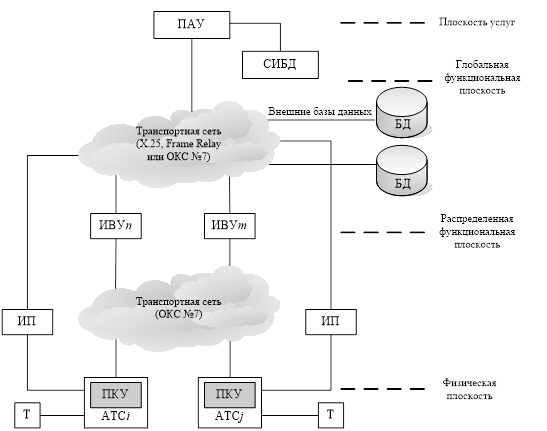 Физическая плоскость представляет физические элементы (PhysicalEntities, РЕ) сети, в которой реализована концепция IN. Этими РЕ могут быть коммутационные станции, выполняющие функции пунктов коммутации услуг – ПКУ (ServiceSwitchingPoint, SSP). Пункт коммутации услуги распознает запросы на предоставление ДВО по коду (префиксу), набираемому пользователем, и формирует заявки к ИВУ. Средства ПКУ являются ведомыми по отношению к ИВУ. Команды, поступающие от ИВУ, определяют последовательность обработки запроса на предоставление услуги.