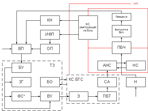 ПБЧ – переключение болевой чувствительности, Н – ноцицептор, АНС – антиноцицептивная система, ФС – физиологические системы, КС – канал согласования биотехнической системы, Э – электроды, ПБТ – пассивная биоткань, СА – сенсорные афференты, ТЗ – технические звенья, ЗГ – задающий генератор, ФС* – формирователь стимула, ВУ – выходной усилитель, БУ и БО – блок управления и блок оценки, КН – клинические наблюдения, ИФП – измерение физиологических показателей, ВП – выработка показаний.