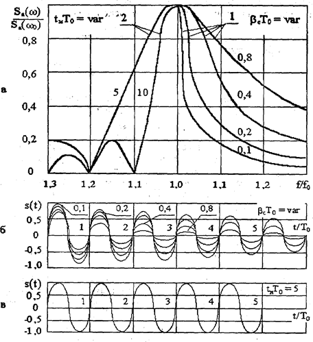 Данное выражение описывает амплитудно-модулированное импульсное колебание с несущей частотой w0 экспоненциально затухающей амплитудой с постоянной времени затухания равной bc-1. По мере расширения спектра длительность стимула уменьшается. На рис.2, а (кривые 1) синтезированный сигнал имеет форму радиоимпульса, где Т0 - период основной частоты.