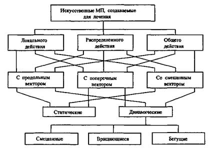 В магнитотерапевтических аппаратах, имеющих наборы индукторов, предусмотрены режимы, при которых осуществляется воздействие, распределенное в заданной области пространства. В некоторых системах, позволяющих осуществлять общее воздействие на весь организм человека, представляется возможным на фоне пространственно равномерной структуры поля формировать локально усиленные (ослабленные) поля, а также неоднородности заданной формы. Заметим, что поля, характеристики которых не изменяются в пространстве, называют статическими, а поля, изменяющиеся и перемещающиеся в пространстве, называют динамическими. Большинство выпускаемых магнитотерапевтических аппаратов формируют, как правило, статические поля. Комплекс «Аврора МК-01» имеет программно-аппаратные средства для создания как статических, так и динамических полей. Возможное множество разновидностей пространственно-организованных искусственных МП представлено на рис. 1.