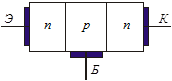 Средняя область транзистора называется базой , одна крайняя область – эмиттером , другая – коллектором . Таким образом, в транзисторе имеются два n–p– перехода: эмиттерный – между эмиттером и базой и коллекторный – между базой и коллектором. Расстояние между ними должно быть очень малым, не более единиц микрометров, т.е. область базы должна быть очень тонкой. Это является условием хорошей работы транзистора. Кроме того, концент`рация примесей в базе всегда значительно меньше, чем в коллекторе и эмиттере. От базы, эмиттера и коллектора сделаны выводы.