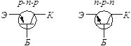 Транзистор представляет собой пластину германия, или кремния, или другого полупроводника, в которой созданы три области с различной электропроводностью. Для примера взят транзистор типа n–p–n , имеющий среднюю область с дырочной, а две крайние области – с электронной электропроводностью. Широко применяются также транзисторы типа p–n–p , в которых дырочной электропроводностью обладают две крайние области, а средняя имеет электронную электропроводность.