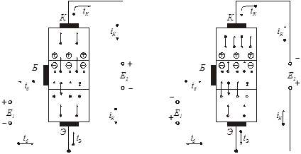 Физические процессы в транзисторе происходят следующим образом. При увеличении прямого входного напряжения Uб-э понижается потенциальный барьер в эмиттерном переходе и соответственно возрастает ток через этот переход – ток эмиттера iэ . Электроны этого тока инжектируются из эмиттера в базу и благодаря диффузии проникают сквозь базу в коллекторный переход, увеличивая ток коллектора. Т.к. коллекторный переход работает при обратном напряжении, то в этом переходе возникают объемные заряды, показанные на рисунке кружками со знаками «+» и «–». Между ними возникает электрическое поле. Оно способствует продвижению (экстракции) через коллекторный переход электронов, пришедших сюда из эмиттера, т.е. втягивают электроны в область коллекторного перехода.