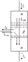 Если толщина базы достаточно мала и концентрация дырок в ней невелика, то большинство электронов, пройдя через базу, не успевает рекомбинировать с дырками базы и достигает коллекторного перехода. Лишь небольшая часть электронов рекомбинирует в базе с дырками. В результате рекомбинации возникает ток базы. В установившемся режиме число дырок в базе должно быть неизменным. Вследствие рекомбинации каждую секунду сколько-то дырок исчезает, но столько же новых дырок возникает за счет того, что из базы уходит в направлении к плюсу источника E1 такое же число электронов. Иначе говоря, в базе не может накапливаться много электронов. Если некоторое число инжектированных в базу из эмиттера электронов не доходит до коллектора, а остается в базе, рекомбинируя с дырками, то точно такое же число электронов должно уходить из базы в виде тока iб . Поскольку ток коллектора получается меньше тока эмиттера, то в соответствии с первым законом Кирхгофа всегда существует следующее соотношение между токами: