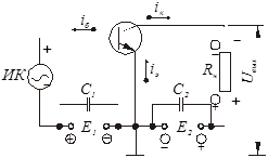 Входное напряжение, которое необходимо усилить, подается от источника колебаний ИК на участок база – эмиттер. На базу подано также положительное смещение от источника E1 , которое является прямым напряжением для эмиттерного перехода. Цепь коллектора (выходная цепь) питается от источника E2 . Для получения усиленного выходного напряжения в эту цепь включена нагрузка Rн .