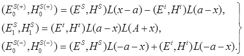 Смысл индексов, которыми снабжены каждая из электромагнитных волн, как видно из формул (6), определяющих эти электромагнитные волны, заключается в следующем. Нижний индекс «0»соответствует тому, что поле удовлетворяет волновому уравнению в вакууме, а индекс «1» - тому, что поле удовлетворяет волновому уравнению в среде с потерями. Другими словами, эти индексы соответствуют значениям индекса j =0, 1 в уравнениях (3). Кроме того, верхний значок (+) указывает на то, что данное поле имеет смысл только при x >a , а значок (-) - на то, что рассматриваемое поле имеет смысл только при x <-a . В силу этих определений делаются особенно ясными аналитические свойства Фурье-компонент каждой электромагнитной волны и становится возможным выполнение исследования, основанного на теоретико-функциональных рассуждениях.