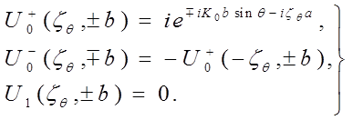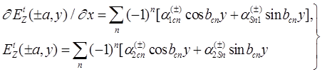 Что касается соотношений (14), то они превращаются в специальный способ разложения в ряд Фурье. Иначе говоря, представляют собой разложения по системе ортогональных функций, превращающихся в нуль при | y | =b. Физически они представляют собой собственные колебания плоскопараллельного волновода. Достаточность таких разложений будет видна из обсуждения свойств регулярности, о которых речь идет ниже. Окончательно, в качестве решения уравнений (12), удовлетворяющих граничным условиям (В2), (В3), можем записать следующие выражения :