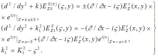 С другой стороны, при |y | £b существует разрыв в среде. В результате выполнения прямого преобразования Фурье в волновом уравнении (3) оно превращается в следующие дифференциальные уравнения неодинакового порядка: