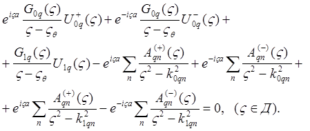 Затем, делим (умножаем) правые части и левые части уравнений (24) на эти функции разложения, исключаем их полюса и выполняем интегрирование вдоль разрезов от точек ветвления. Если выполнить описанные действия, то обе части уравнений (24) можно разложить таким образом, что они окажутся регулярными соответственно в верхней полуплоскости (область U